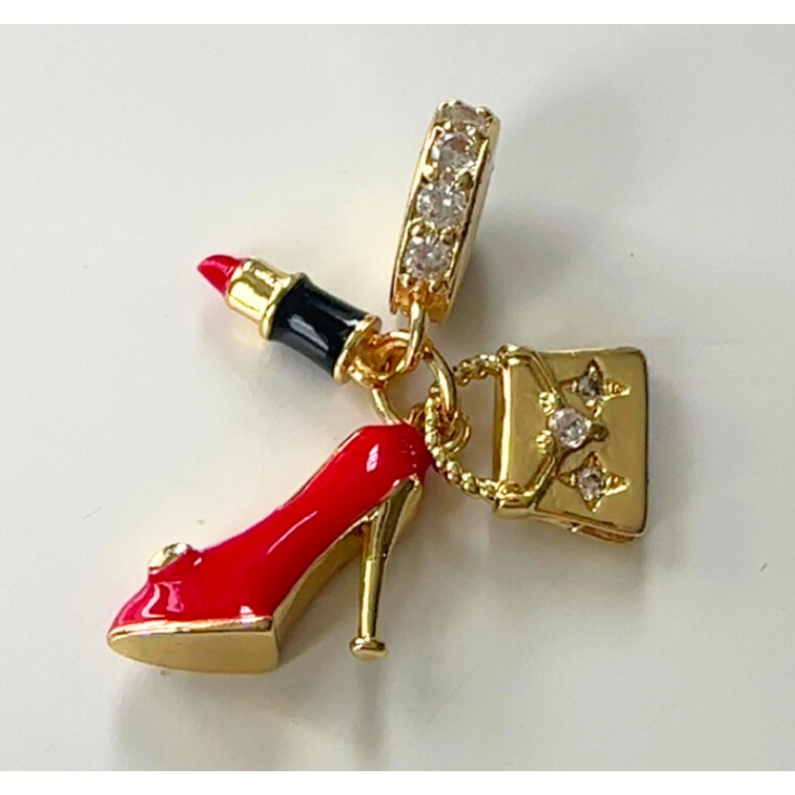 Step into glamour with this trio of iconic charms—red high heels, a chic purse, and bold lipstick—all sparkling with rhinestone accents on gold-filled bases. Perfect for the ultimate fashion lover, this set adds a playful yet polished touch to any bracelet or necklace. Shine bright and show off your style, one charm at a time.