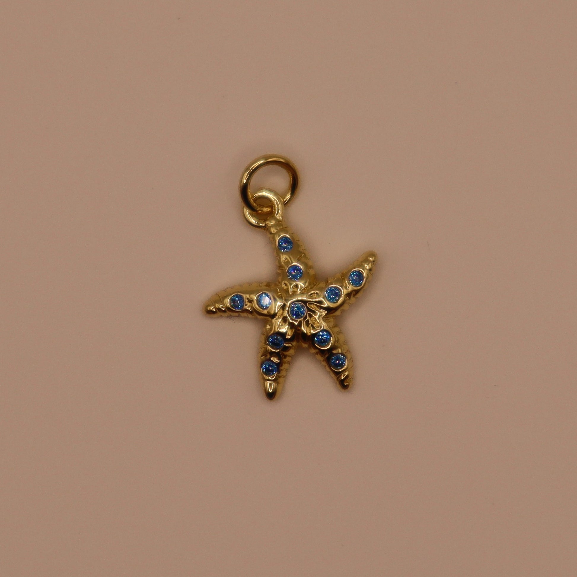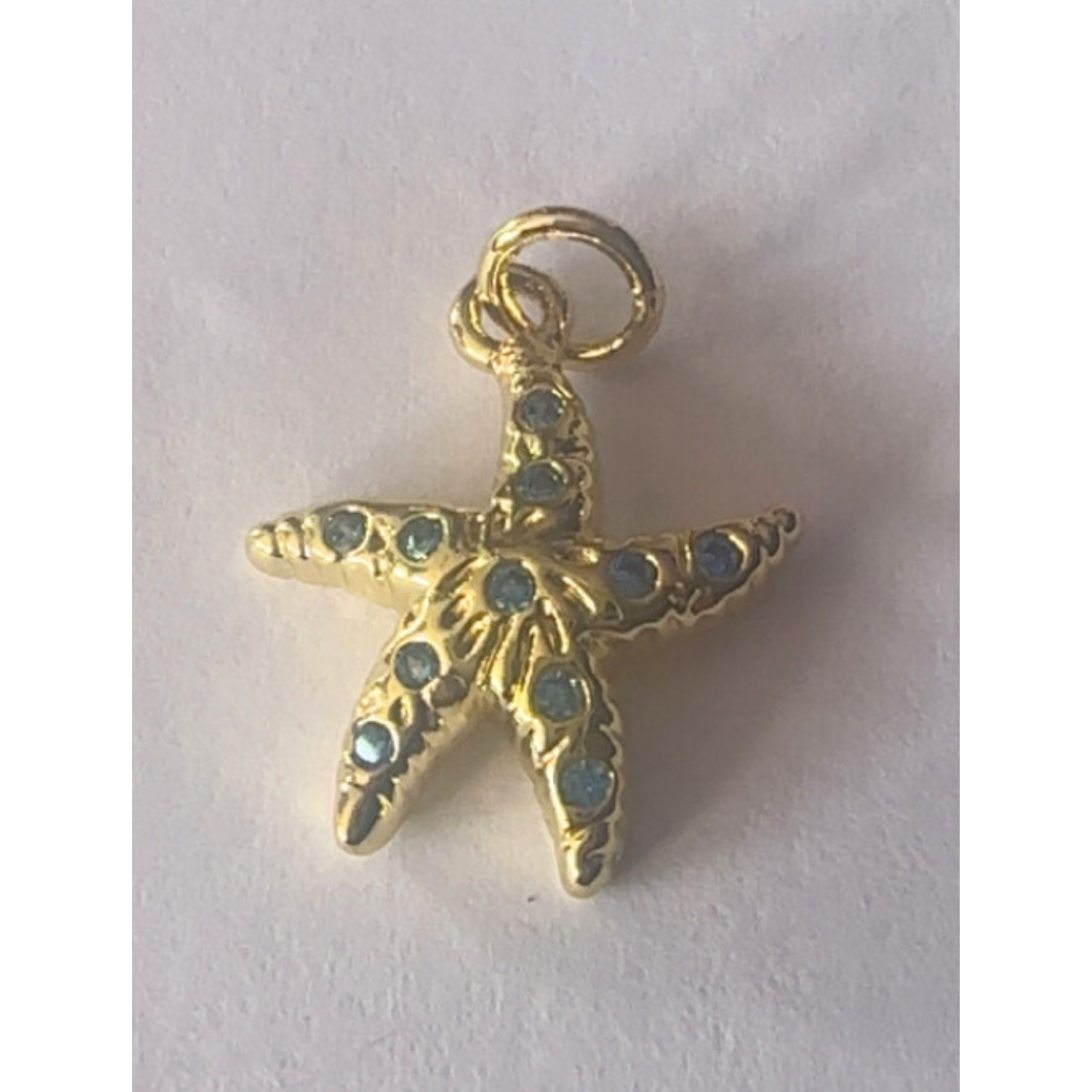 Bring beachy vibes everywhere you go with this shimmering gold filled starfish charm. Dusted with sparkling blue rhinestones, it’s a subtle nod to sun-soaked days and salty air. A perfect pop of coastal charm for your chain.